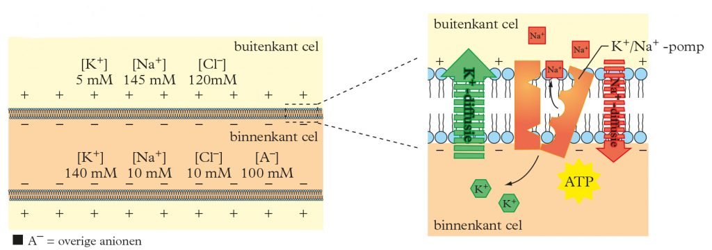 De membraanpotentiaal is gebaseerd op de verschillende diffusie snelheden van Na+ naar binnen en K+ naar buiten. Deze diffusiesnelheden zijn gebaseerd op de concentratieverschillen van beide ionen binnen en buiten de cel. De natrium-kaliumpomp is verantwoordelijk voor het handhaven van deze concentratieverschillen. Naar buiten gediffundeerde K+ ionen en naar binnen gediffundeerde Na+ ionen worden door de natrium-kaliumpomp terug getransporteerd, zodat de concentratieverschillen gehandhaafd blijven en de membraanpotentiaal blijft bestaan. Dit is echter actief transport, omdat de ionen tegen het concentratie verval heen getransporteerd moeten worden. Het laten draaien van de natrium-kaliumpomp kost de cel ATP.